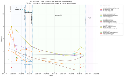 ChatGPT - I have used this the longest, and although it can frustrate me, it has been able to help me a ton in ways that my doctors can't. For example, I have trended my symptoms and my tumor growth overlaid with treatments. I have asked it to translate jargon, explain scans, trend blood test results and tumor sizes. Most of my examples in this post are from ChatGPT since I have used it the longest.