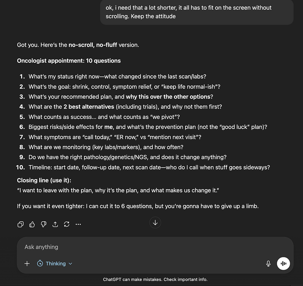Ask it to build you a snapshot, based on all of your interactions, uploads, etc, that you can share with a new doctor. The example below is very abbreviated but I wanted to show you what it could look like. It has summarized my diagnosis, meds, treatment history, imaging, tumor size, etc. I asked it to keep it on one screen, but this could give me a lot more detail if I was doing this for a new doctor appointment.